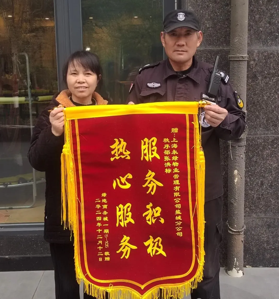 近日,我司駐鹽城永綠項目,一期五棟上演了溫馨一幕,保安員張洪標(biāo)收獲了來自5棟-105業(yè)主的致謝錦旗。