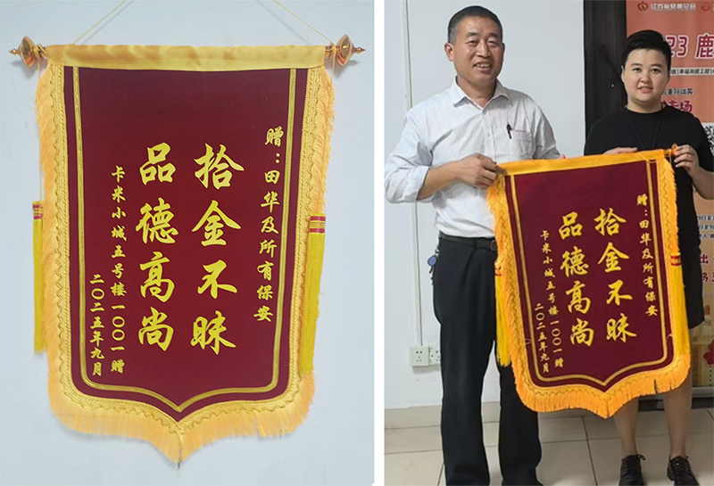 一面錦旗,一份認(rèn)可!近日,花橋綠地雅苑的業(yè)主張女士,專程送來一面滿載感謝的錦旗,這份特殊的心意,源于一場溫暖的拾金不昧之舉。
